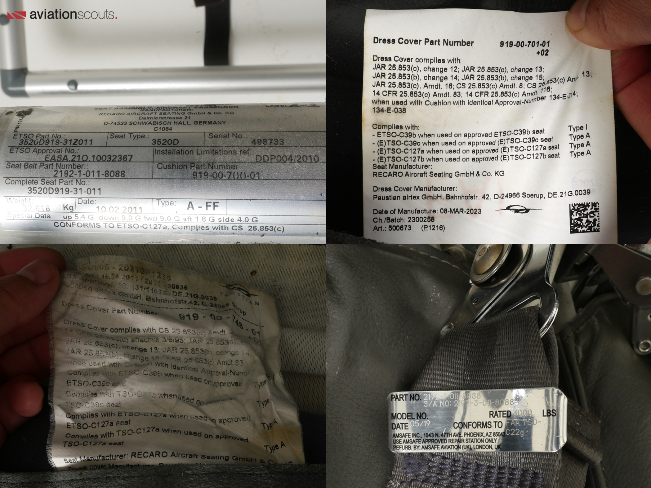 This offering includes a shipset of Recaro 3520D919 economy class seats for the Airbus A320 family, available in as-removed condition. In total, 192 passenger seats are included, with 180 configured as a complete shipset and the balance available as spare parts. The seats feature a six-abreast economy layout, mechanical recline, and are certified to TSO-C127a (16G standard). With an average weight of 13 kg per passenger place, the Recaro 3520D919 is recognized as a lightweight and reliable seat type widely used on A320 aircraft.